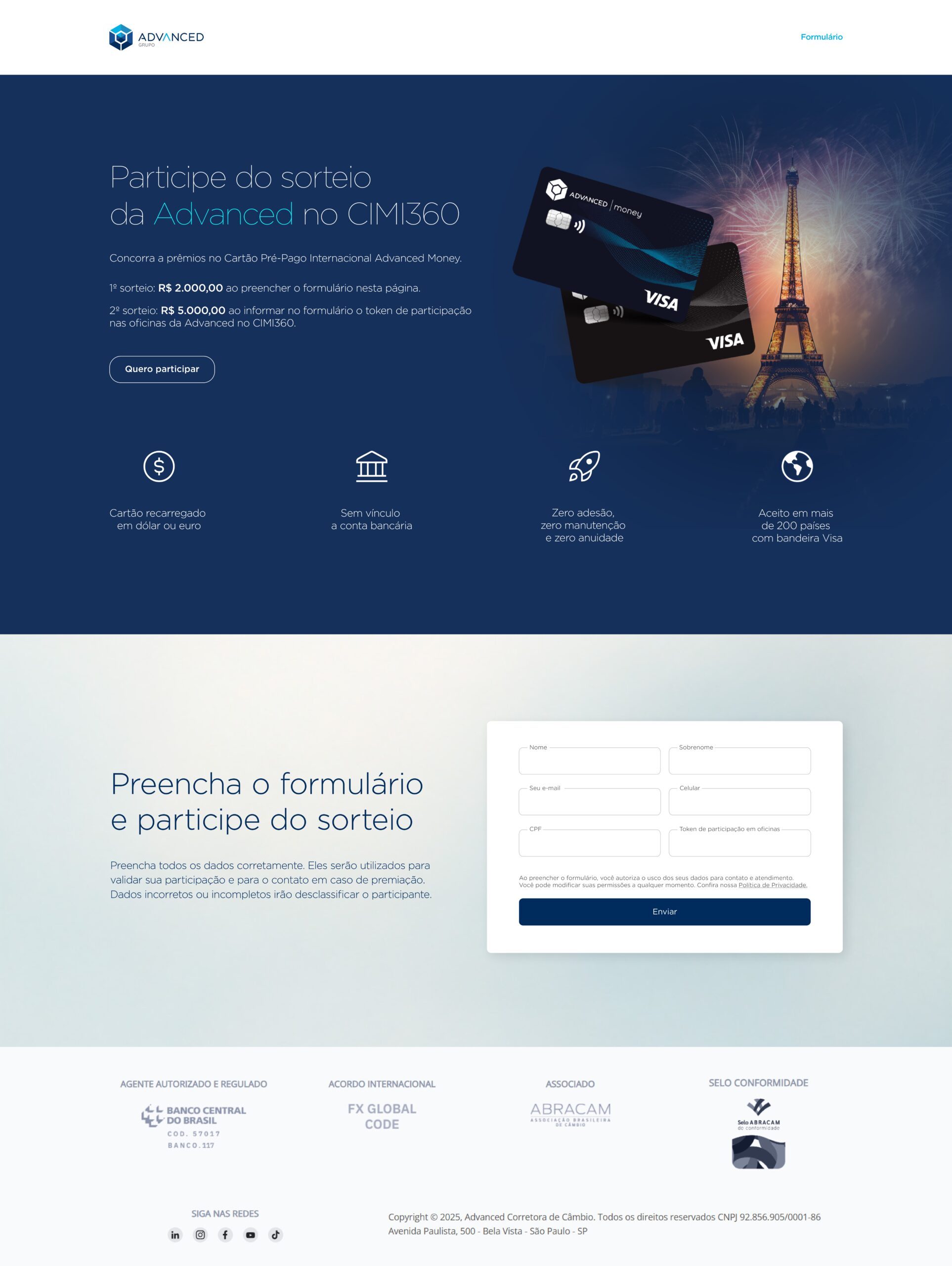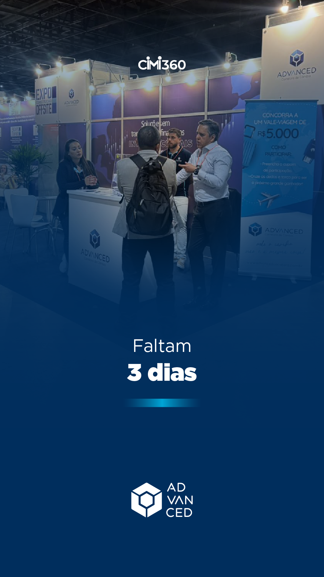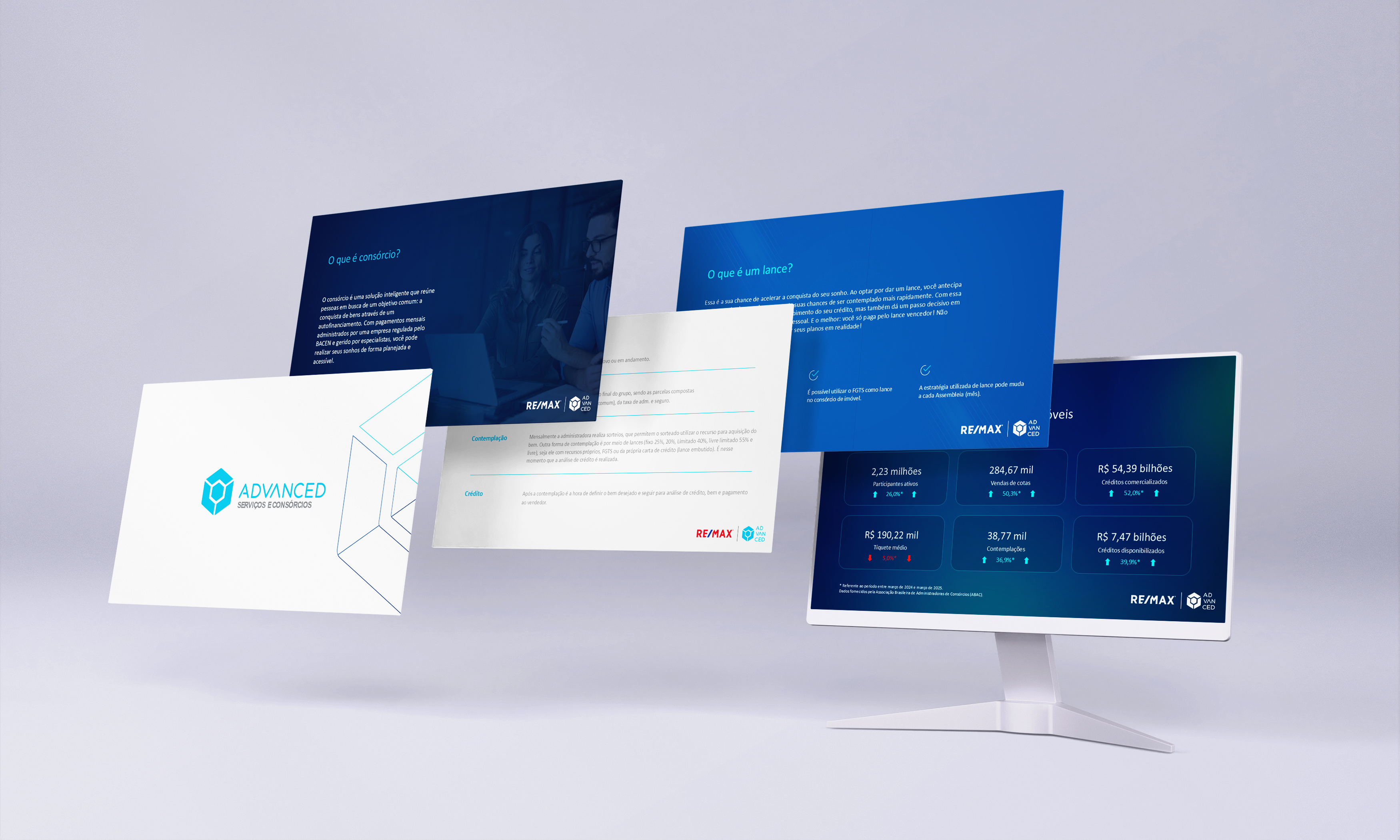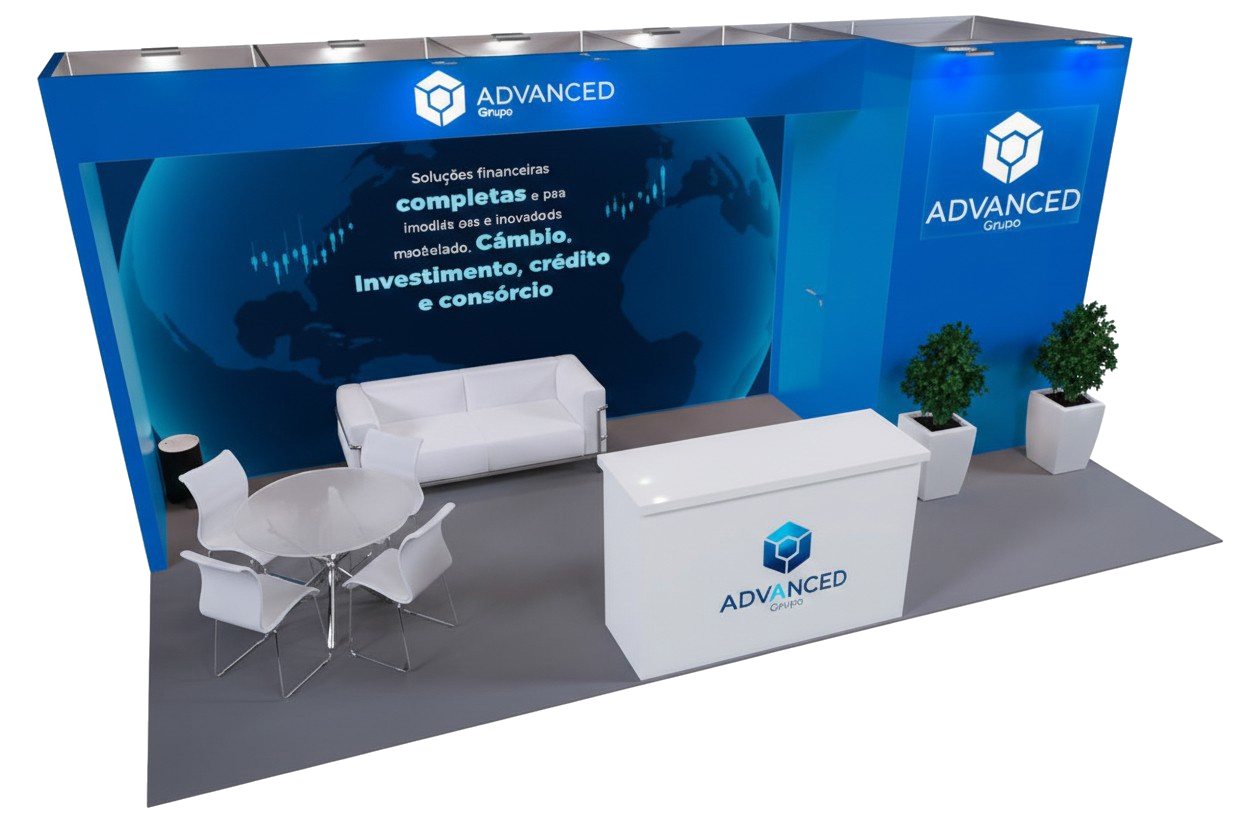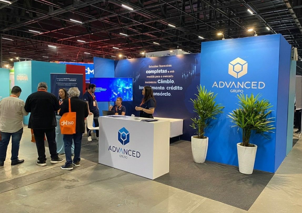Desenvolver um estande e materiais de divulgação para a atração de novos clientes dentro do evento CIMI 360. A Advanced Grupo estava se posicionando com novos produtos, entre eles o consórcio. Aqui o desafio era dar suporte ao time comercial, que estava atuando presencialmente no evento, divulgando o serviço de consórcio imobiliário de forma atrativa e coerente com a estratégia do negócio, branding e identidade visual da marca.